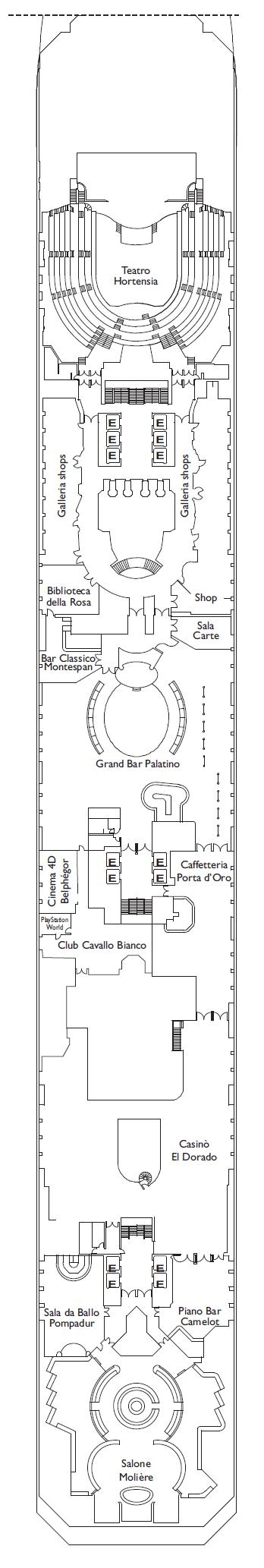| Dekken: | Villa Borghese dek, La Zarzuela dek, Alhambra dek, Babilonia dek | |